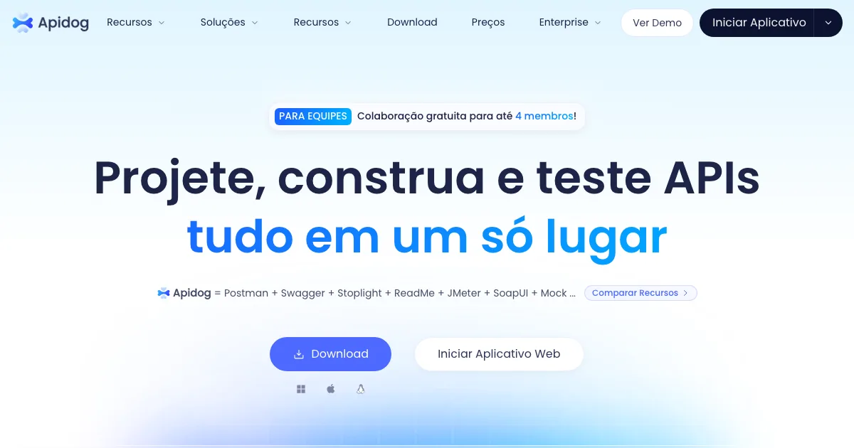 Apidog é uma plataforma de apis & testes que ajuda times técnicos a ganhar velocidade e contexto no desenvolvimento. Plataforma de Desenvolvimento API REAL Design-first.