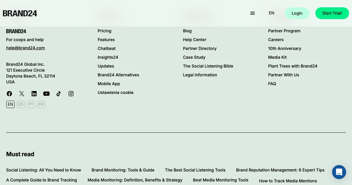 Brand24 é uma plataforma de social listening que ajuda equipes a monitorar menções de marca em tempo real, acompanhar reputação e crises e analisar sentimento e share of voice. Nos dados coletados, a ferramenta destaca recursos como What kind of data do we collect?, How do I get PDF reports and what’s in it? e How to use required or excluded keywords?.