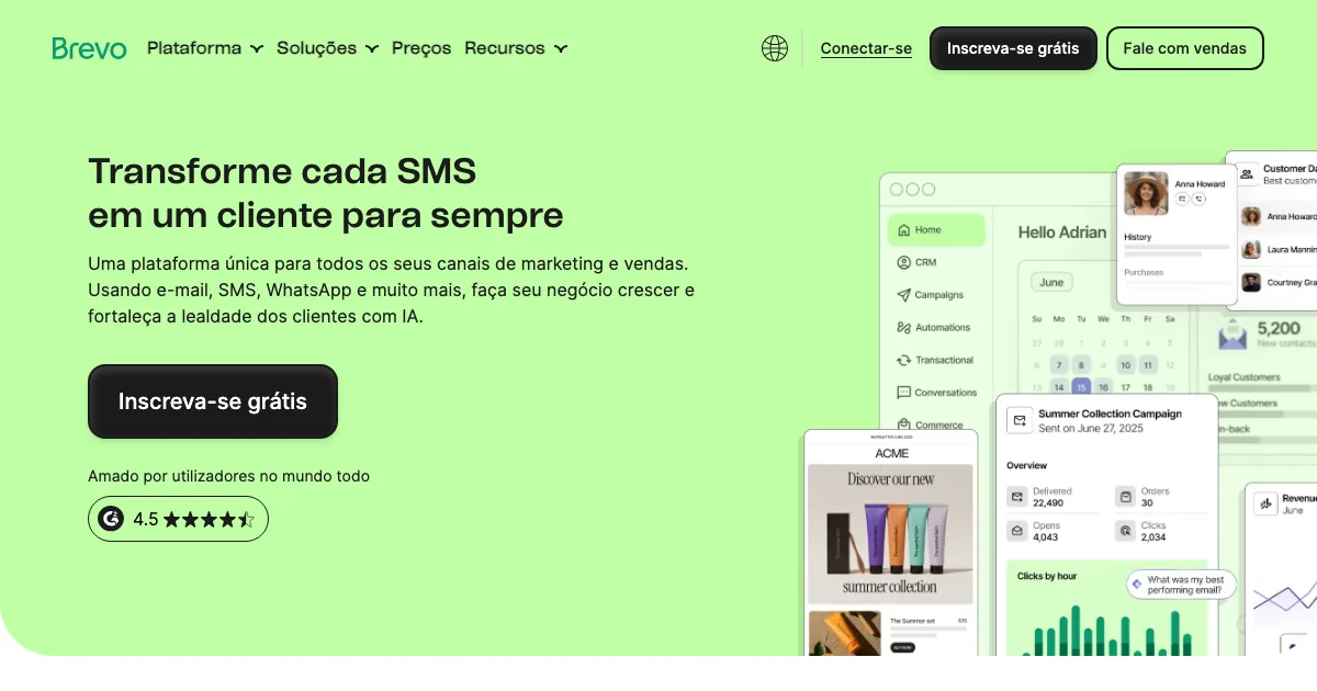 Brevo é uma plataforma de email marketing e automação que ajuda equipes a criar fluxos de nutrição, enviar campanhas segmentadas e automatizar jornadas de onboarding e retenção. Nos dados coletados, a ferramenta destaca recursos como Canais - E-mail - SMS - WhatsApp - Notificações web & mobile push - Chat ao vivo - Chatbot - Wallet - VoIP..., E-commerce & retail - Recupera i carrelli abbandonati, personalizza le offerte prodotto e aumenta la fedeltà. e Templates de e-mail.