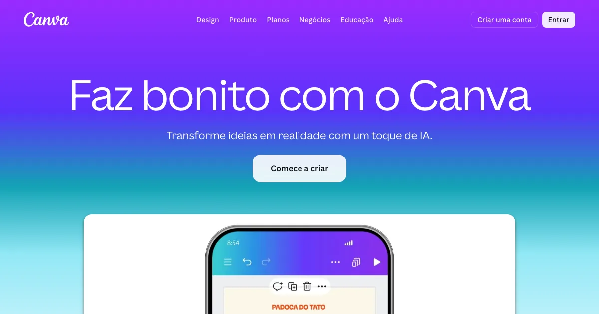 Canva é uma ferramenta de IA da subcategoria design gráfico que ajuda profissionais a criar peças visuais, layouts e materiais gráficos com mais eficiência.