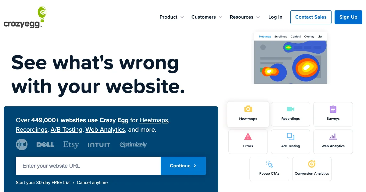 Crazy Egg é uma ferramenta de analytics comportamental que ajuda equipes a entender comportamento em páginas, mapear pontos de abandono e validar hipóteses de UX. Nos dados coletados, a ferramenta destaca recursos como Heatmap Reports, Session Recordings e Conversion Funnels.