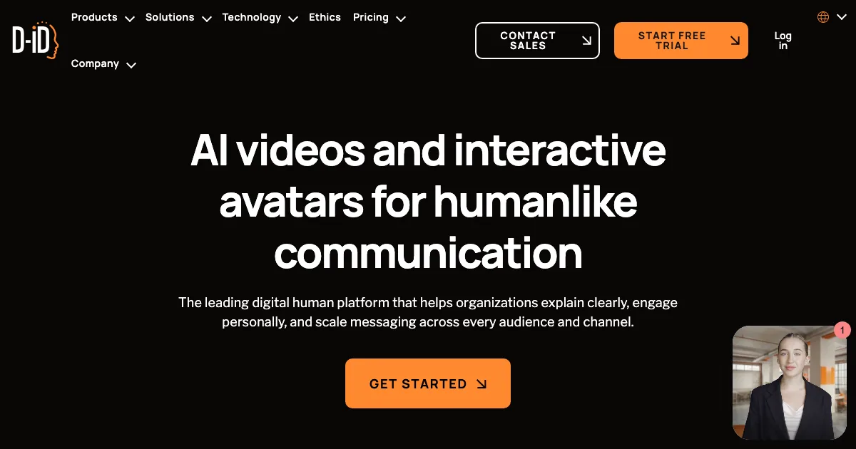 D-ID é uma plataforma para criar vídeos com avatares de IA, narração sintética e tradução multilíngue para treinamento e comunicação.