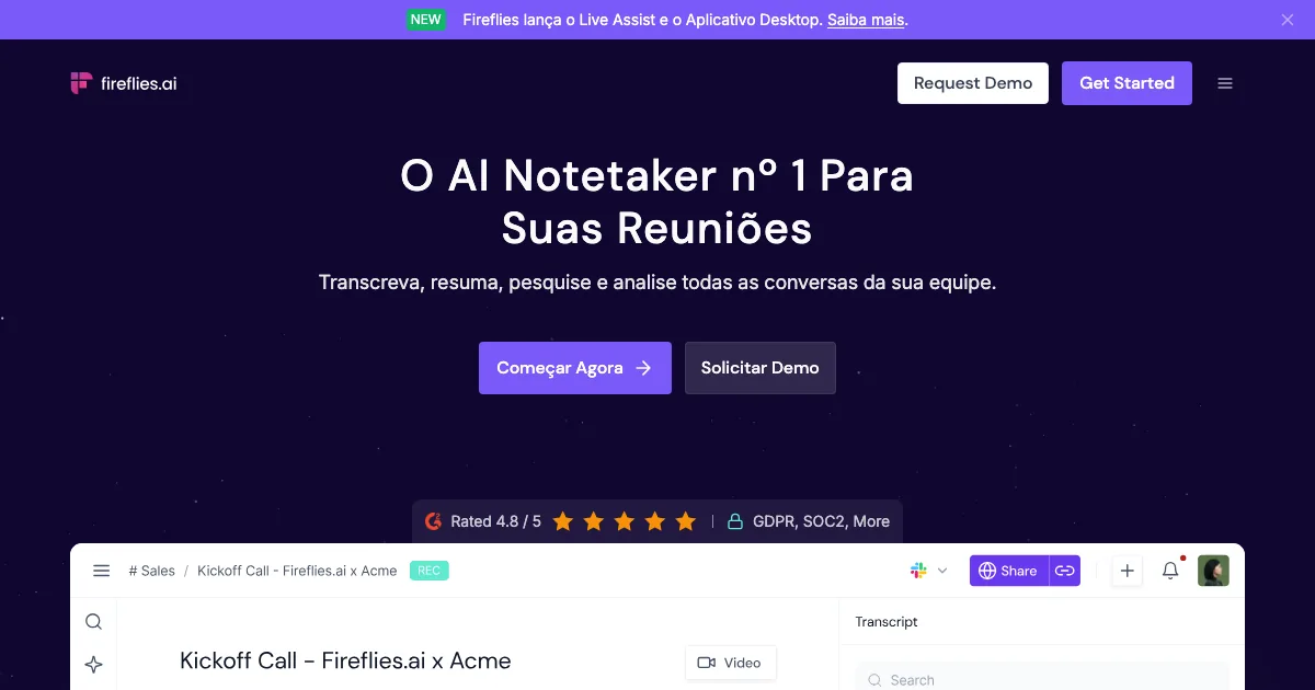 Fireflies.ai é uma ferramenta de reuniões com ia que usa inteligência artificial para acelerar trabalho, organizar informações e automatizar tarefas do dia a dia.