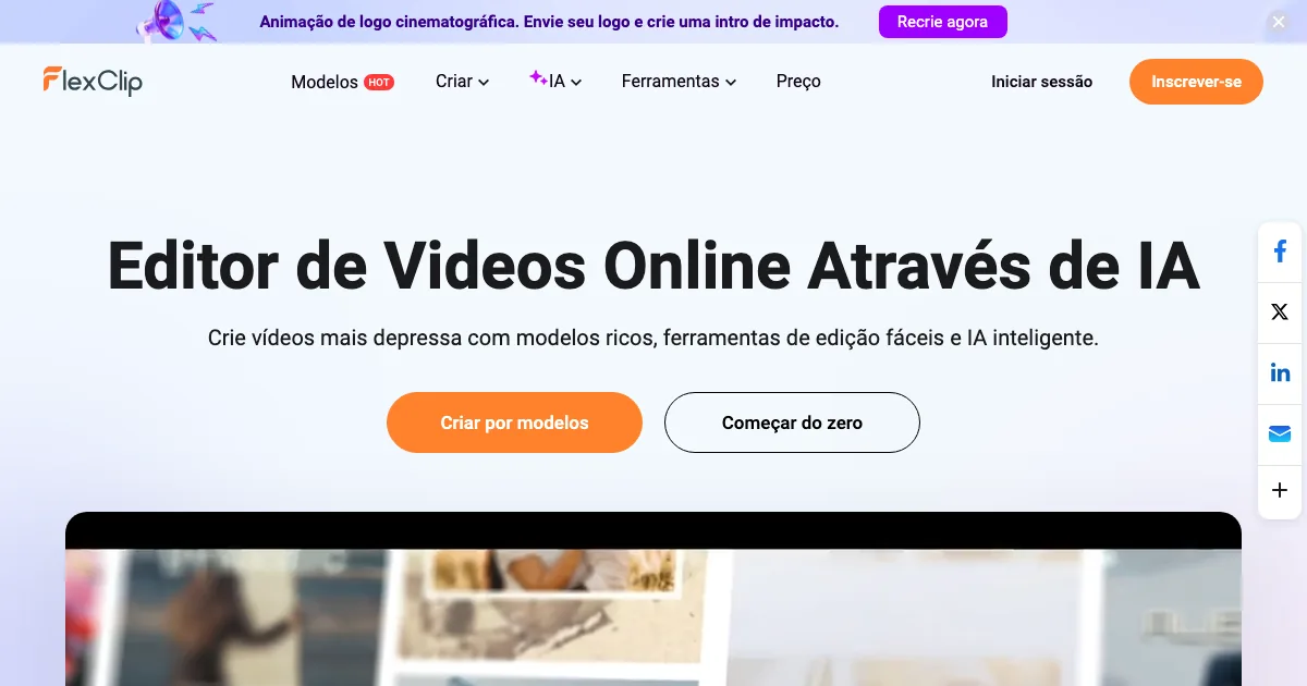 FlexClip é uma ferramenta de edição de vídeo com IA que acelera cortes, legendas, ajustes de áudio e adaptação para redes sociais.
