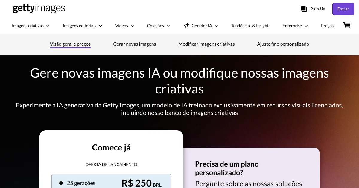 Getty Images Generative AI é uma ferramenta de IA da subcategoria geração de imagens que ajuda equipes e criadores a transformar prompts em artes, conceitos visuais e peças criativas com mais velocidade.