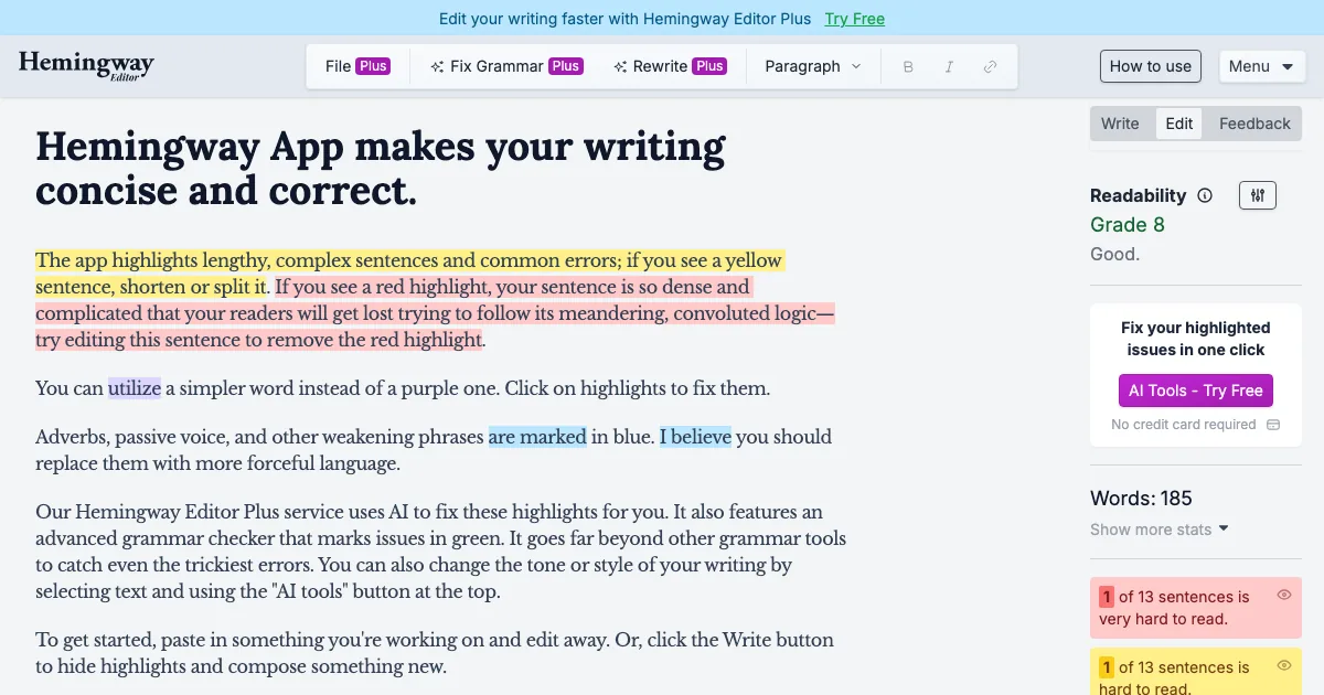 Hemingway Editor é uma ferramenta de IA da subcategoria legibilidade que ajuda equipes e profissionais a revisar texto, melhorar estilo e simplificar texto com mais eficiência.