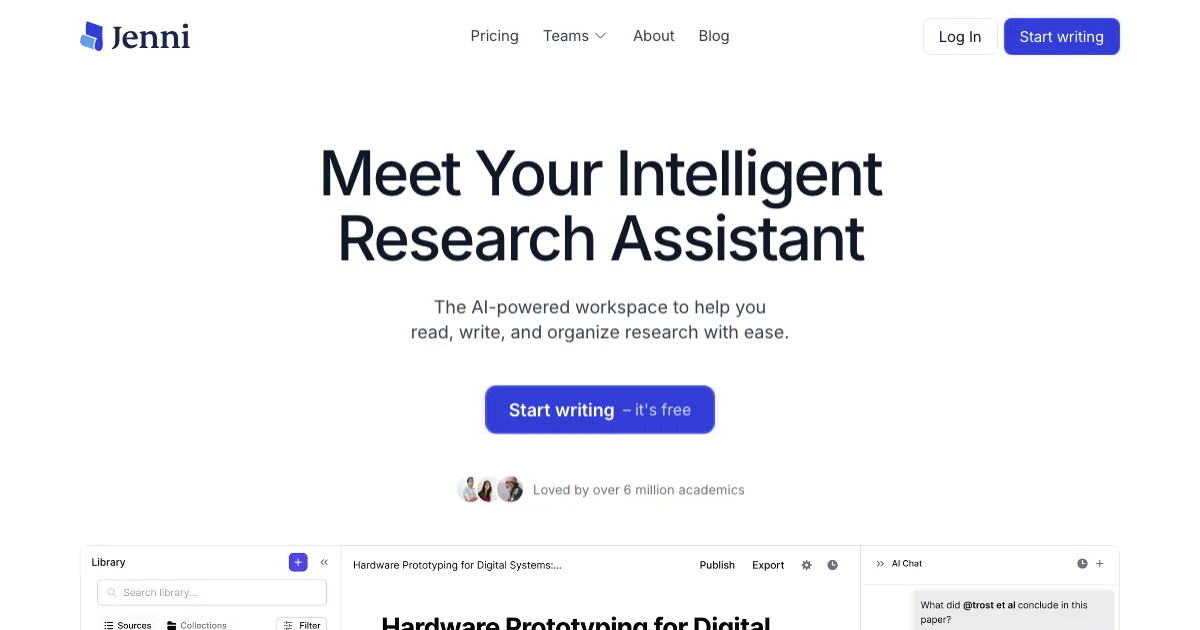 Jenni AI é uma ferramenta de IA da subcategoria escrita acadêmica que ajuda equipes e profissionais a criar conteúdo, citar fontes e resumir textos com mais eficiência.
