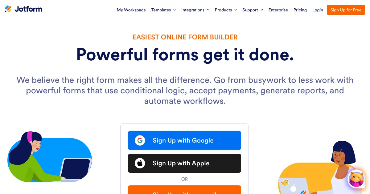 Jotform é uma plataforma de formulários e coleta de dados que ajuda equipes a criar formulários de lead, rodar pesquisas e quizzes e coletar feedback de clientes. Nos dados coletados, a ferramenta destaca recursos como Form Templates, Card Form Templates e App Templates.