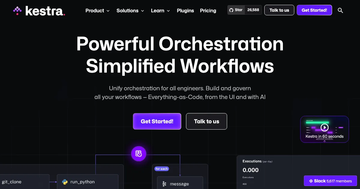Kestra é uma solução para construir agentes, apps com LLM e fluxos de IA com mais controle técnico. Costuma ser usada por times que precisam combinar prompts, ferramentas, memória, RAG e ações em produção.