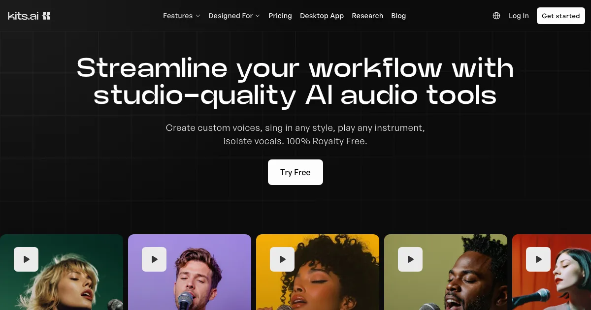 Kits AI é focada em limpar, separar e melhorar faixas de áudio com recursos de restauração, stems e voz.