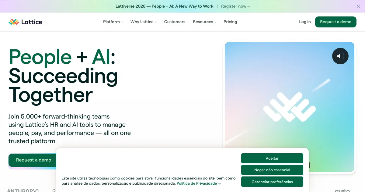 Lattice é uma ferramenta para medir engajamento, estruturar feedback e desenvolver desempenho nas equipes. Seus destaques incluem Performance e engajamento, Feedback contínuo, Avaliações.