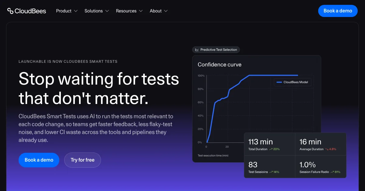 Launchable é uma plataforma de testes automatizados que ajuda times técnicos a ganhar velocidade e contexto no desenvolvimento. Run fewer tests and ship faster with CloudBees Smart Tests.