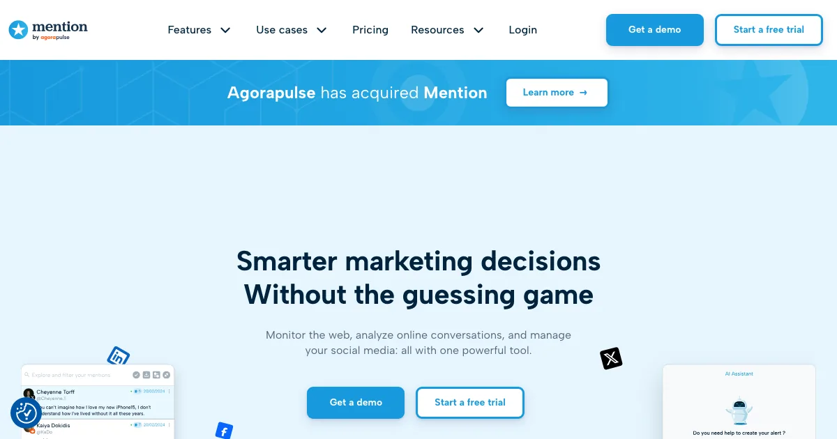 Mention é uma plataforma de social listening que ajuda equipes a monitorar menções de marca em tempo real, acompanhar reputação e crises e analisar sentimento e share of voice. Nos dados coletados, a ferramenta destaca recursos como Duration1 year, Durationsession e DescriptionDescription is currently not available..