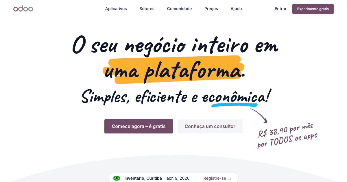 Odoo é uma plataforma empresarial para unificar dados, processos e automações entre áreas como finanças, operações, vendas e RH. Seus destaques incluem Fluxos de trabalho integrados, Automação entre departamentos, Gestão financeira.
