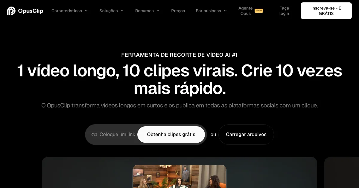 Opus Clip transforma vídeos longos em cortes curtos prontos para Shorts, Reels e TikTok com apoio de IA.