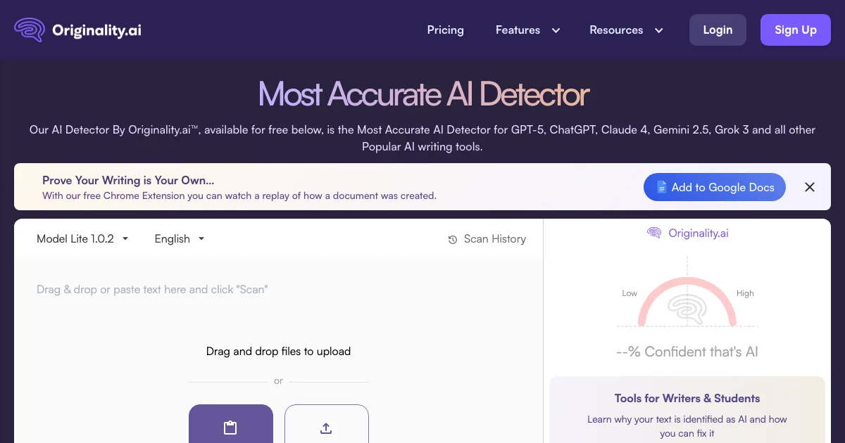 Originality.ai é uma ferramenta de IA da subcategoria detecção de ia que ajuda equipes e profissionais a detectar ia, verificar plágio e revisar texto com mais eficiência.
