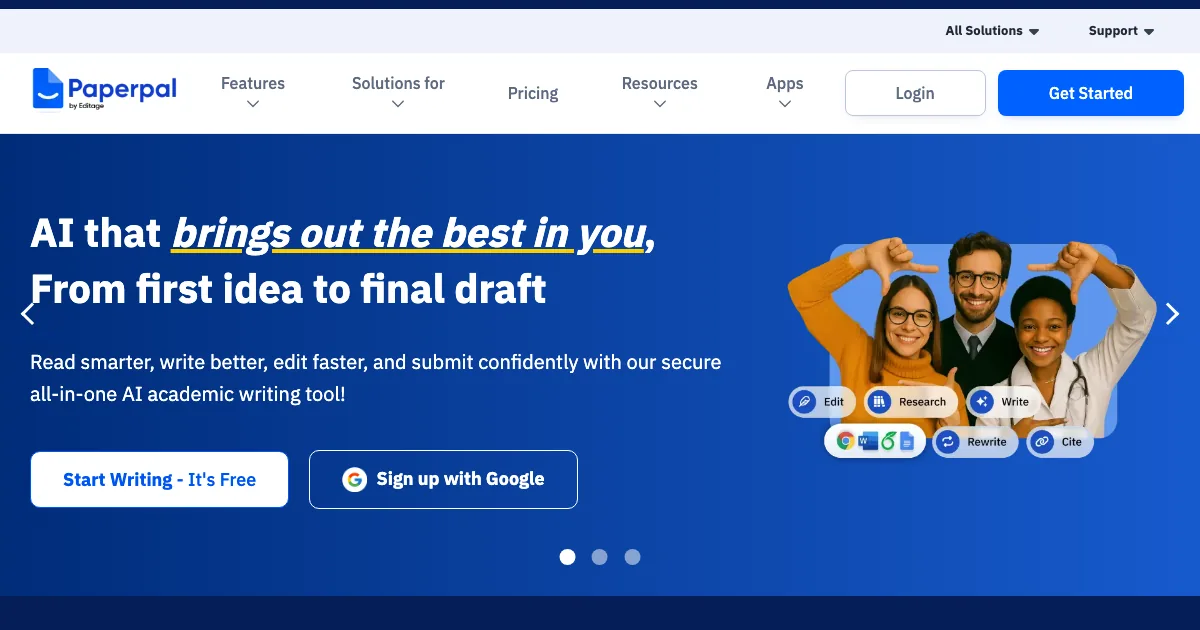 Paperpal é uma ferramenta de IA da subcategoria escrita acadêmica que ajuda equipes e profissionais a revisar texto, corrigir gramática e citar fontes com mais eficiência.