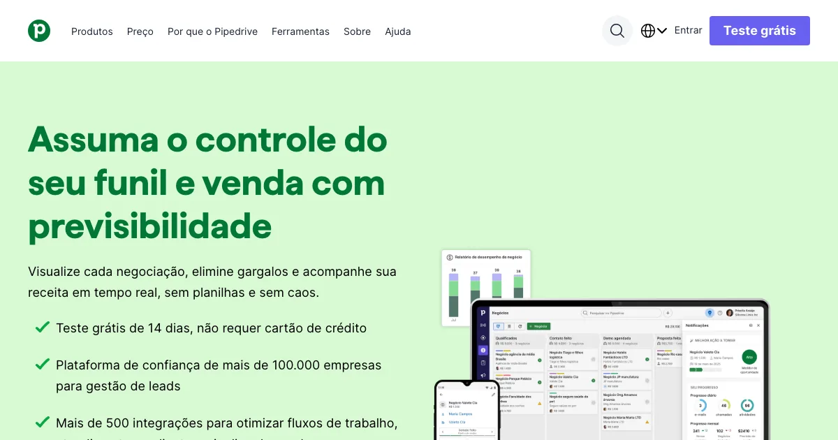 Pipedrive é uma plataforma de CRM e automação de vendas que ajuda equipes a organizar o funil de vendas, automatizar follow-ups e centralizar dados de clientes. Nos dados coletados, a ferramenta destaca recursos como Mais de 500 integrações para otimizar fluxos de trabalho, atendimento ao cliente e pipeline de vendas, IA integrada, automação de vendas e automação de marketing para fechar negócios mais rápido e Personalize seu funil de vendas e seus relatórios de resultados.
