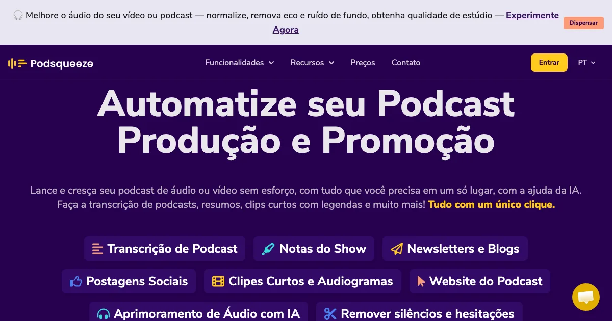 Podsqueeze ajuda a gravar, limpar, editar e publicar áudio e podcasts com fluxos simplificados apoiados por IA.