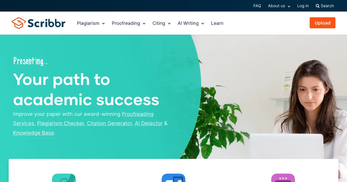 Scribbr é uma ferramenta de IA da subcategoria escrita acadêmica que ajuda equipes e profissionais a citar fontes, revisar texto e verificar plágio com mais eficiência.
