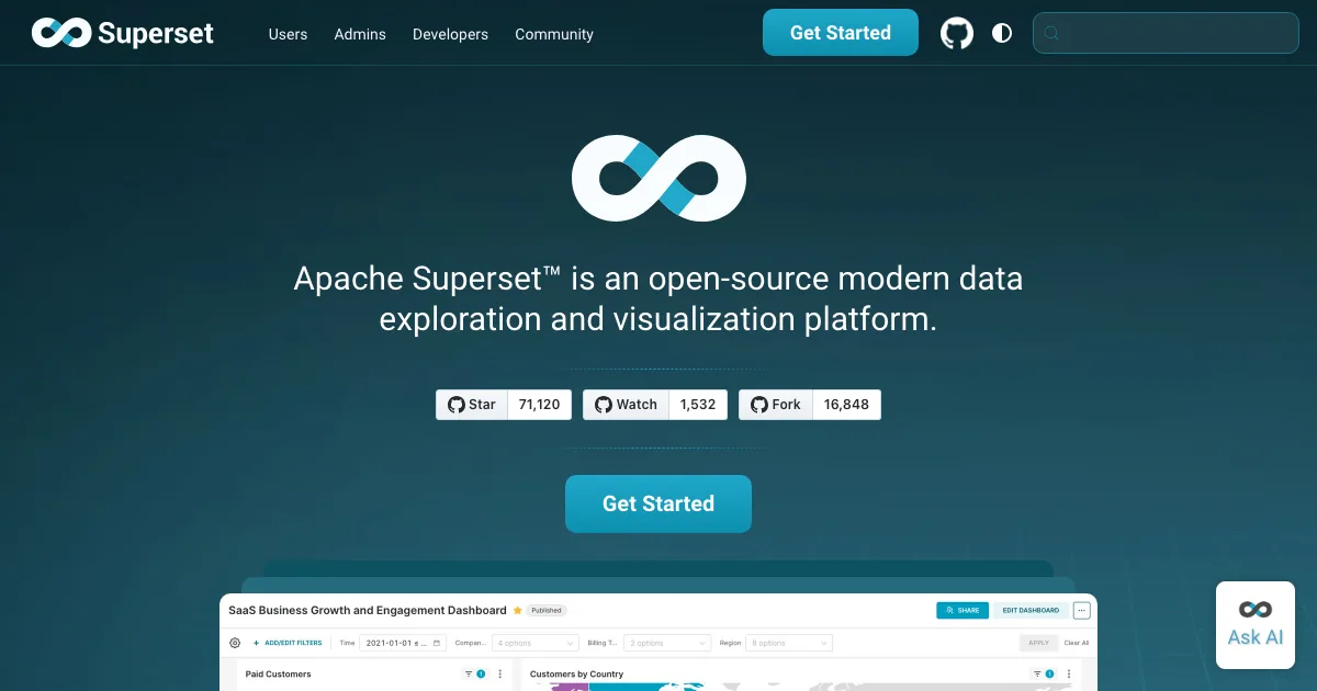Superset é uma solução de dados para coletar, organizar, analisar e compartilhar informações relevantes para o negócio. Seus destaques incluem BI e visualização, Dashboards e relatórios, Analytics.