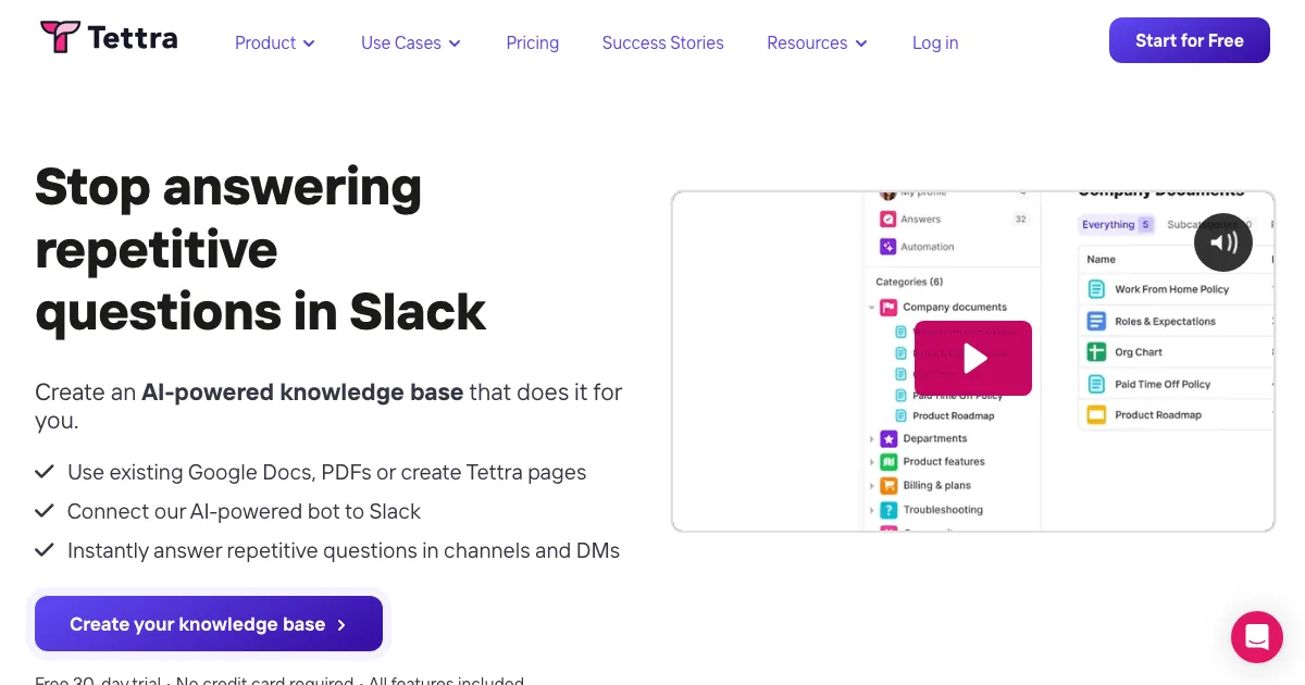 Tettra é uma ferramenta para centralizar documentação, respostas internas e conhecimento compartilhado da empresa. Seus destaques incluem Busca e conhecimento, Documentos colaborativos, Respostas com IA.