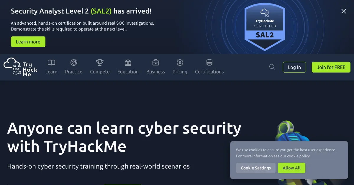 TryHackMe is a free online platform to learn cyber security through hands-on labs and exercises, accessible entirely in your browser—perfect for all skill levels.