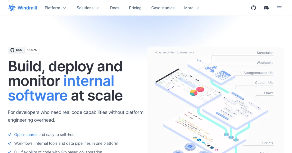 Windmill é uma solução para construir agentes, apps com LLM e fluxos de IA com mais controle técnico. Costuma ser usada por times que precisam combinar prompts, ferramentas, memória, RAG e ações em produção.
