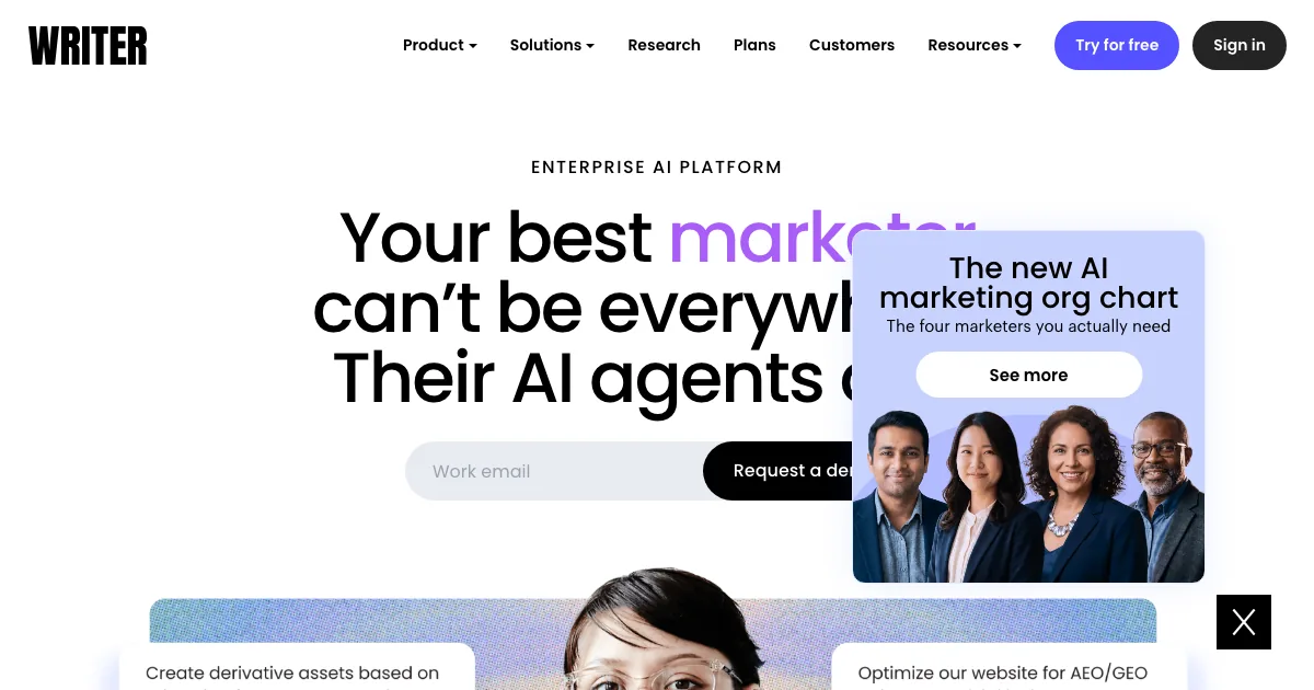 Writer é uma ferramenta de IA da subcategoria conteúdo corporativo que ajuda equipes e profissionais a criar conteúdo, padronizar marca e revisar texto com mais eficiência.