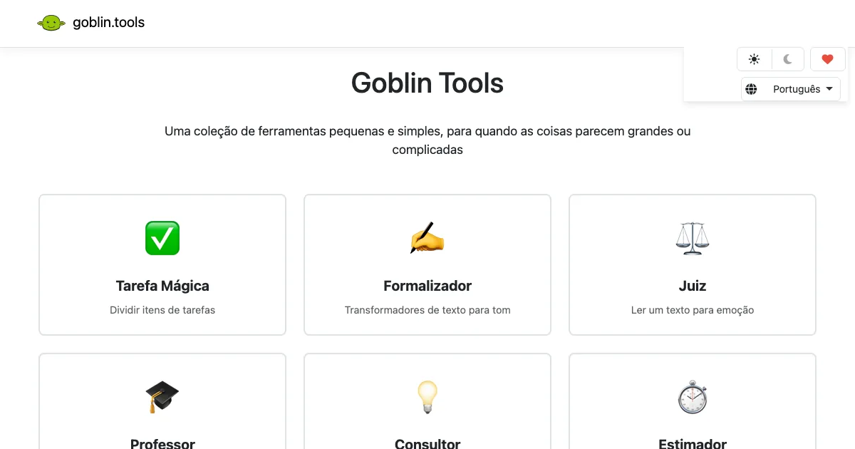 Goblin Tools é uma ferramenta de assistência para tarefas que usa inteligência artificial para acelerar trabalho, organizar informações e automatizar tarefas do dia a dia.