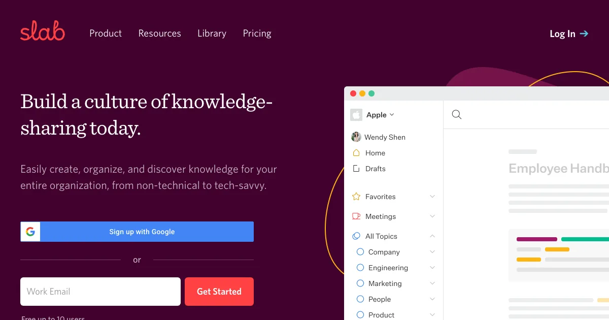 Slab é uma ferramenta para centralizar documentação, respostas internas e conhecimento compartilhado da empresa. Seus destaques incluem Busca e conhecimento, Documentos colaborativos, Respostas com IA.