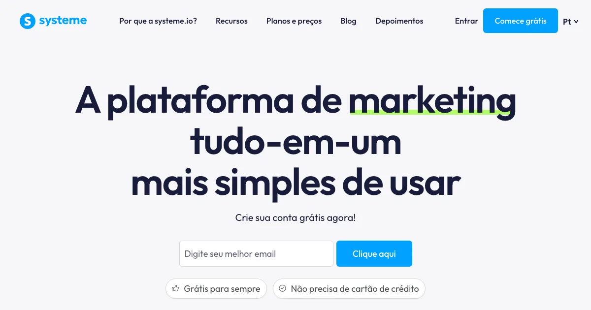 Systeme.io é uma plataforma de landing pages e funis que ajuda equipes a criar páginas de captura, montar funis de conversão e testar ofertas e mensagens. Nos dados coletados, a ferramenta destaca recursos como Por que a systeme.io?, Planos e preços e Depoimentos.