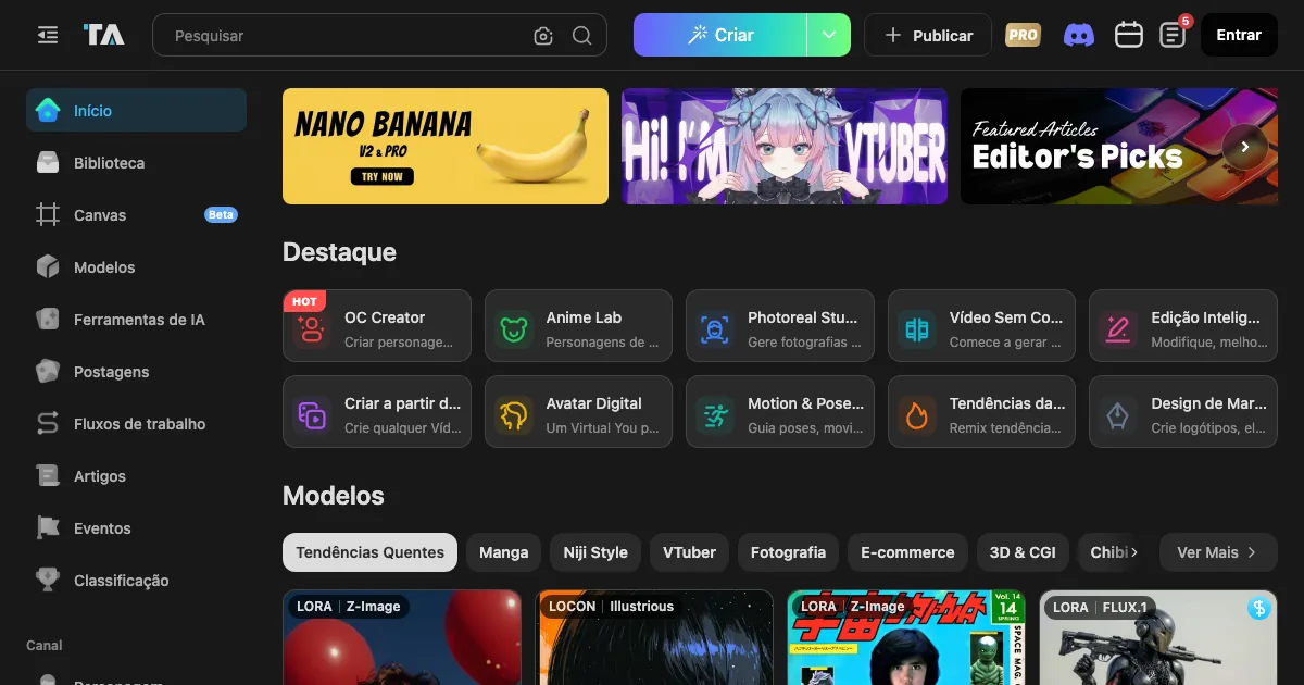 Tensor.Art é uma ferramenta de IA da subcategoria geração de imagens que ajuda equipes e criadores a transformar prompts em artes, conceitos visuais e peças criativas com mais velocidade.