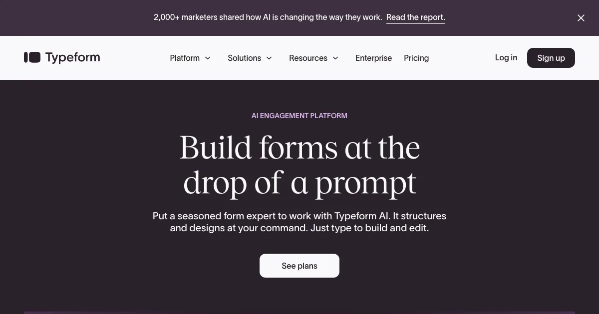 Typeform é uma plataforma de formulários e coleta de dados que ajuda equipes a criar formulários de lead, rodar pesquisas e quizzes e coletar feedback de clientes. Nos dados coletados, a ferramenta destaca recursos como Platform overviewWhat is Typeform?, Typeform AIYour AI know-pilot e Video engagementInteractive video forms.